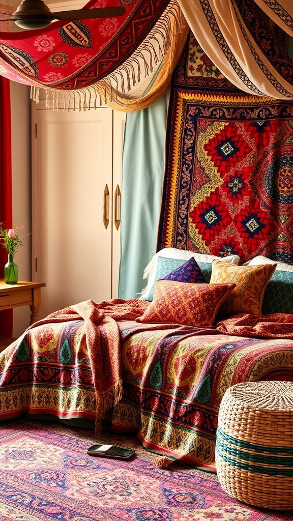 The bedding is another highlight, featuring a soft, textured throw with patterns that echo the ethnic vibe. This not only enhances comfort but also ties together the theme of the room. Accessories like the woven baskets and unique lamps add layers of visual interest, making the room feel lived-in and warm.